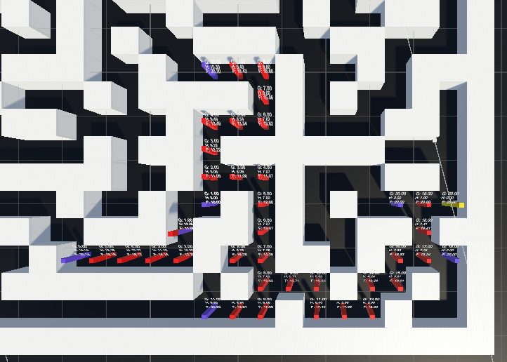 This project demonstrates the implementation of the A* pathfinding algorithm within a randomly generated maze. The maze generation is achieved using a recursive division algorithm, and the pathfinding process is visualized in real-time, showcasing the F, G, and H values used to determine the optimal path.
